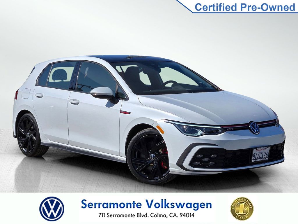 New Price! CARFAX One-Owner. Certified. White Pearl 2022 Volkswagen Golf GTI 2.0T SE FWD 7-Speed DSG Automatic with Tiptronic 2.0L TSI DOHC 112 POINT INSPECTION, NAVIGATION, 18" Black Alloy Wheels, 4-Wheel Disc Brakes, 9 Speakers, ABS brakes, Actively Ventilated Front Seats, Air Conditioning, Alloy wheels, AM/FM radio: SiriusXM with 360L, Auto-dimming Rear-View mirror, Auto-Dimming Rearview Mirror w/HomeLink Connect (DISC), Automatic temperature control, Black Wheel Package, Brake assist, Cloth Seating Surfaces, Compass, Delay-off headlights, Dual front impact airbags, Dual front side impact airbags, Electronic Stability Control, Emergency communication system: VW Car-Net services (capabilities require enrollment or subscription), Exterior Parking Camera Rear, Forward collision: FCW w/Autonomous Emergency Braking mitigation, Four wheel independent suspension, Front anti-roll bar, Front Bucket Seats, Front Center Armrest, Fully automatic headlights, harman/kardon® Speakers, Heated door mirrors, Heated front seats, Heated Front Top Sport Seats, Heated steering wheel, Lane Departure Warning System, Leather steering wheel, Low tire pressure warning, Navigation System, Occupant sensing airbag, Outside temperature display, Overhead airbag, Padded Door Panels w/Leatherette Inserts, Panic alarm, Power door mirrors, Power driver seat, Power moonroof: Panoramic, Power passenger seat, Power steering, Power windows, Radio data system, Radio: MIB3 Discover Pro w/10" Touchscreen Navi, Rain sensing wipers, Rear anti-roll bar, Rear window defroster, Rear window wiper, Remote keyless entry, SE Leather Package, Security system, Speed control, Speed-sensing steering, Speed-Sensitive Wipers, Split folding rear seat, Steering wheel mounted audio controls, Tachometer, Telescoping steering wheel, Tilt steering wheel, Traction control, Trip computer, Variably intermittent wipers, Vienna Leather Seating Surfaces, Wheels: 18" x 7.5J 2-Tone Machined Alloy.